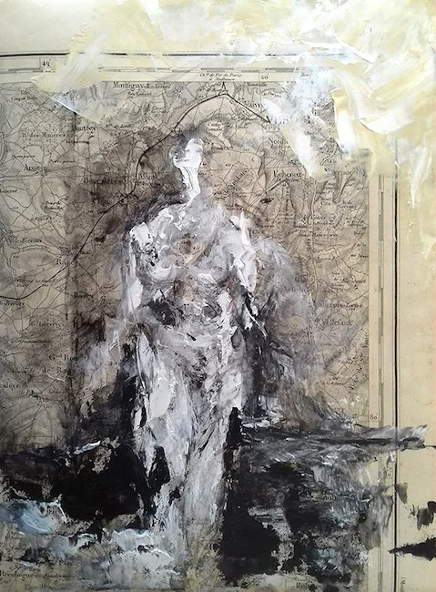 Contrairement à ces parchemins anciens dont la première écriture a été grattée et effacée complètement au profit d'un nouveau texte, les images que je propose jouent avec la cartographie dont des traces subsistent. Ces bribes cartographiques préservées constituent alors la mémoire partielle et parfois aléatoire de lieux avec lesquels les formes et la couleur interagissent.
